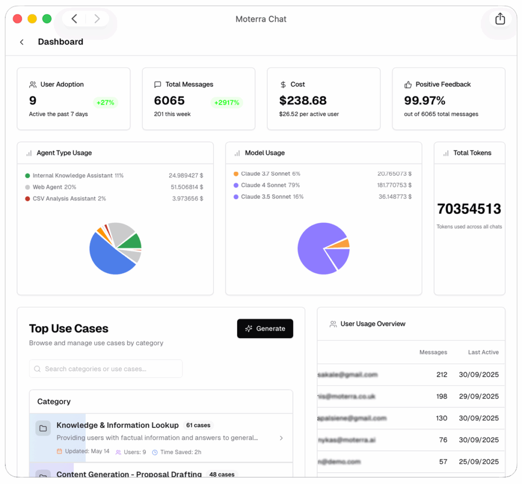 Setup takes days, not months. Our AI specialists will customise everything to your templates for maximum impact. Plus, with our built-in usage insights dashboard, you can track adoption metrics, monitor costs, and measure ROI from day one to demonstrate the business value of your AI investment.