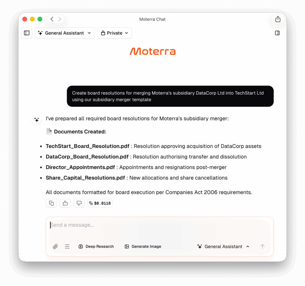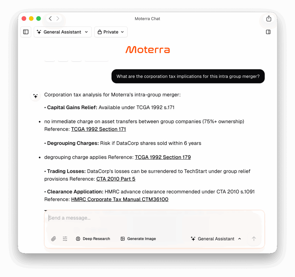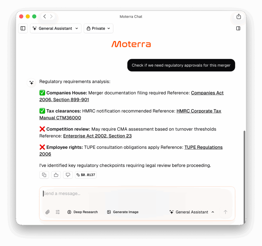 Moterra’s AI legal assistant answers complex legal questions. It gives structured responses and cites laws, cases, and guidance. It searches public legal databases and official publications in real time.