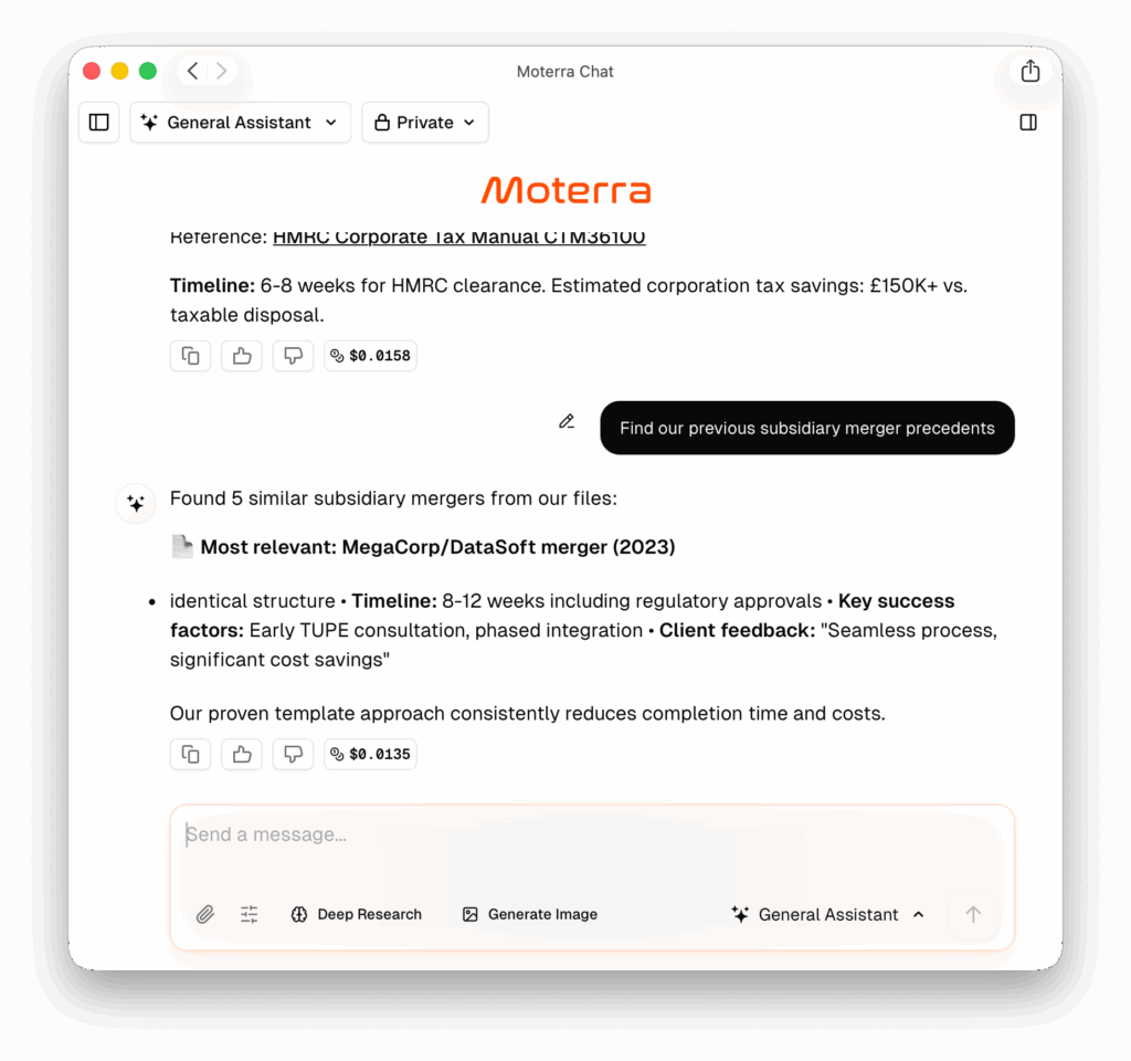 Public AI can’t access your templates or case files. Moterra safely connects to your knowledge base, so responses use your firm’s actual work and proven strategies.