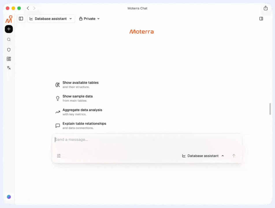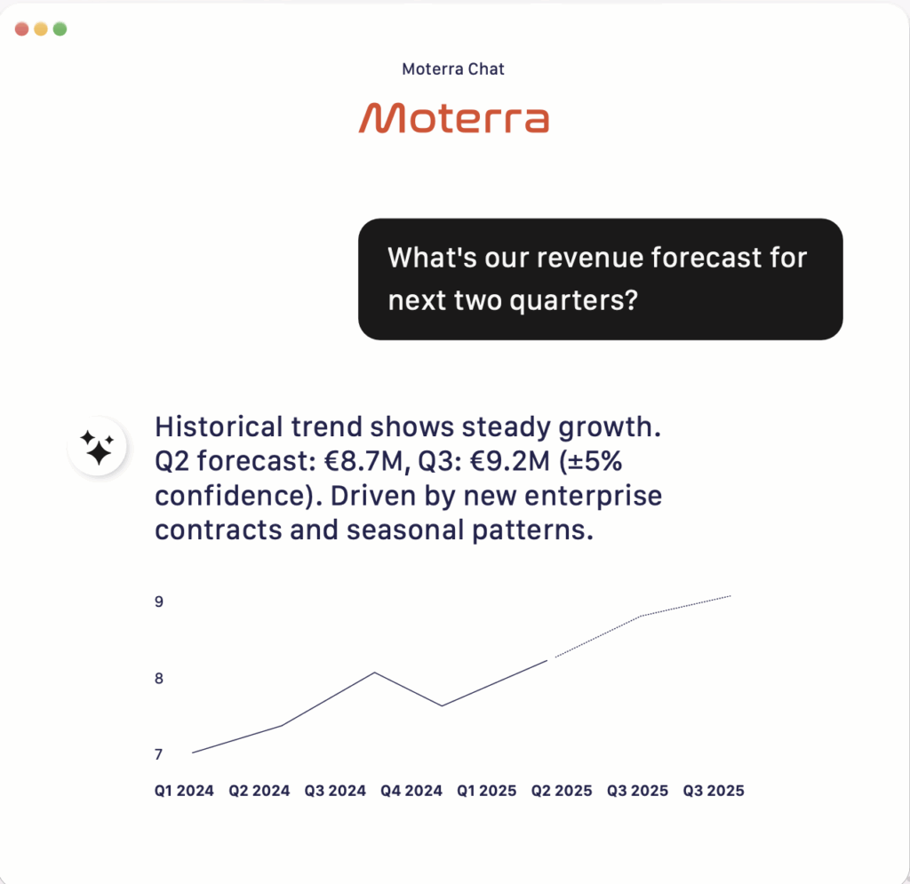 The key difference: You don’t need to choose the model or configure parameters. Simply ask questions like “What will our sales look like next quarter?” or “Which factors most influence customer churn?” and Moterra handles the technical complexity automatically.