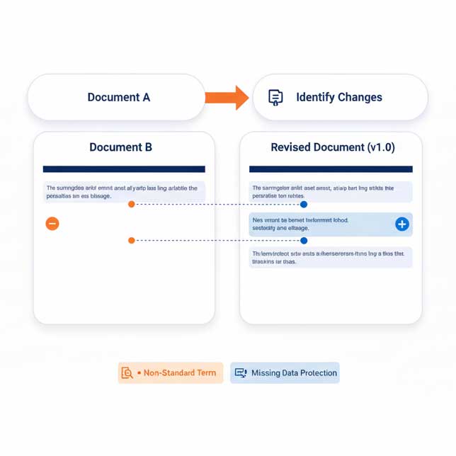 The assistant compares any two documents, contracts, policies, or forms, and highlights every change down to the clause. It flags non-standard terms, missing data protection, or unusual indemnity language. You get a clear, side-by-side view.